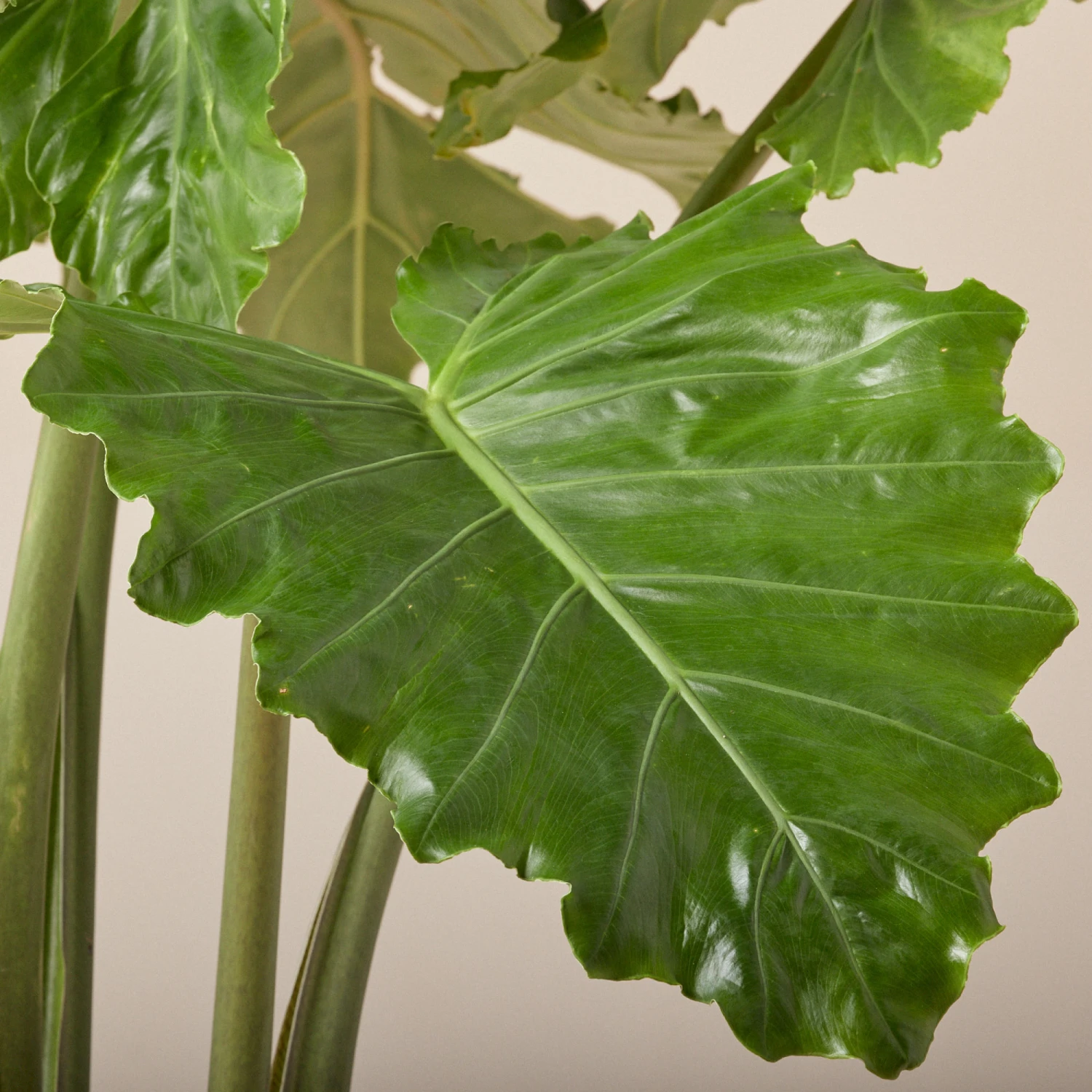 Alocasia ‘Portadora’, commonly called the Elephant Ear plant, is a popular indoor plant known for its large, dramatic foliage and tropical appeal. With glossy, heart-shaped leaves and prominent veining, Alocasia ‘Portadora’ adds a striking focal point to any room.