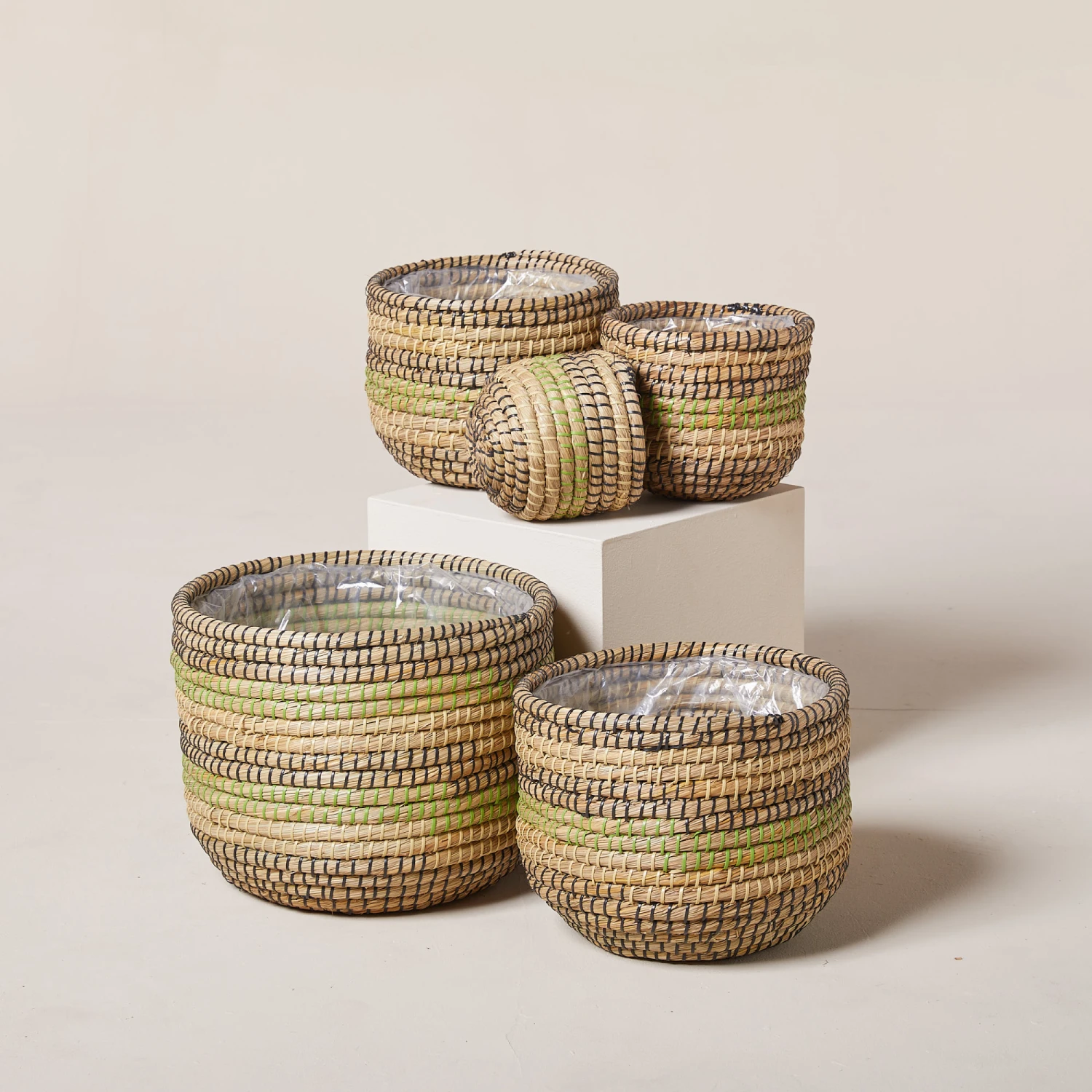 The Jane series of indoor pots are delightful, handmade woven baskets with a built-in plastic liner. Available in a range of sizes, they feature horizontal bands of contrasting colours.