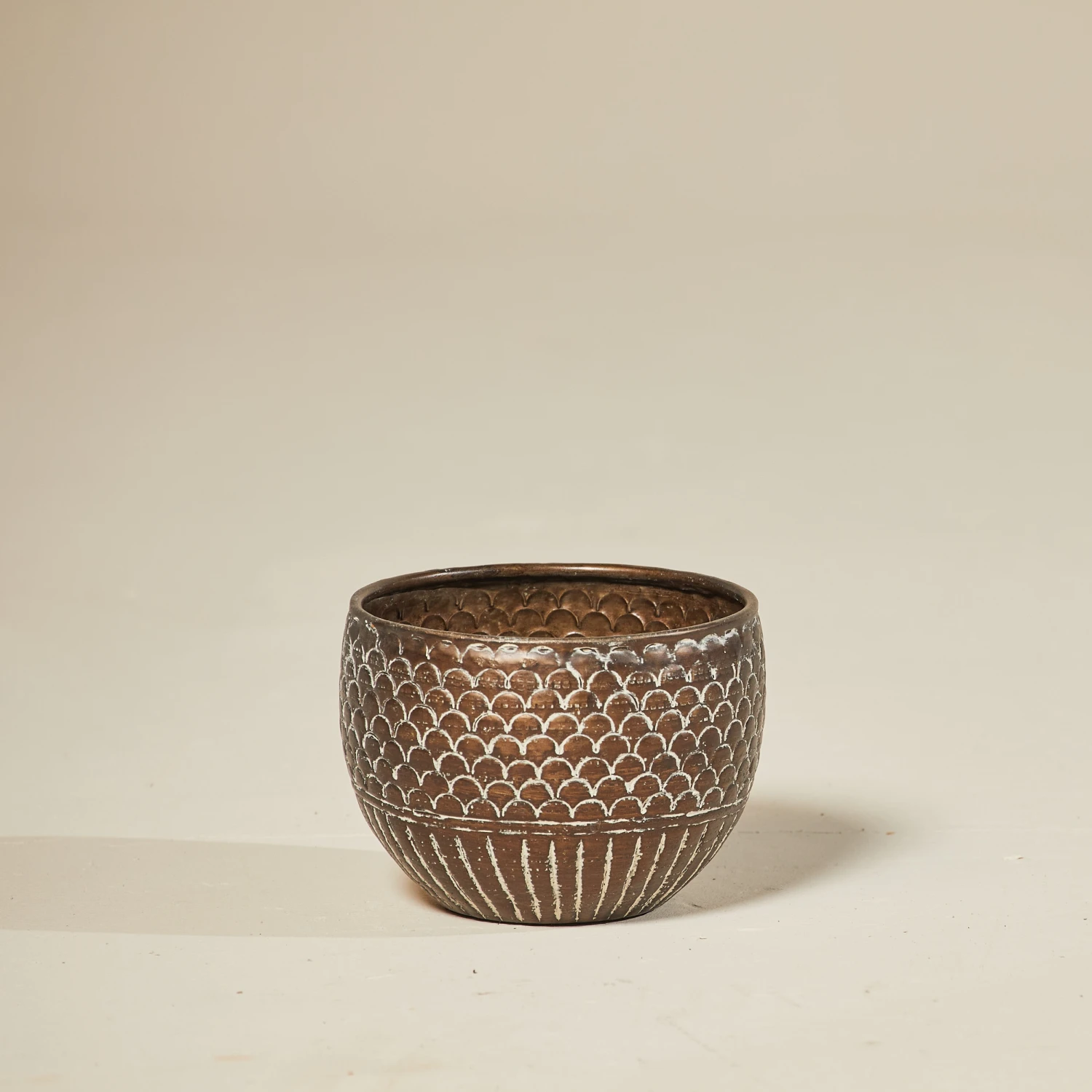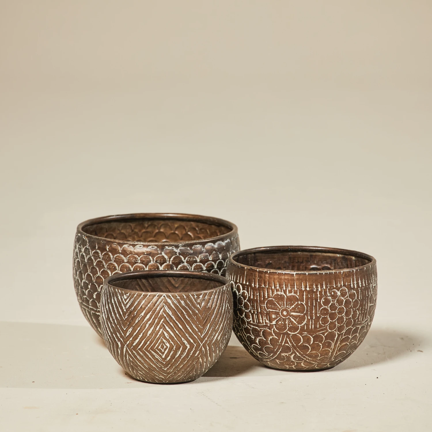 These gorgeous metal pots with a copper hue will show off your prized plants to their best advantage. With textured patterns inset with a light patina, the design will add a touch of the tropics to any indoor environment. This oxidised effect gives the suggestion of a pot that has aged over many years and will quickly give your houseplants a timeless feel.