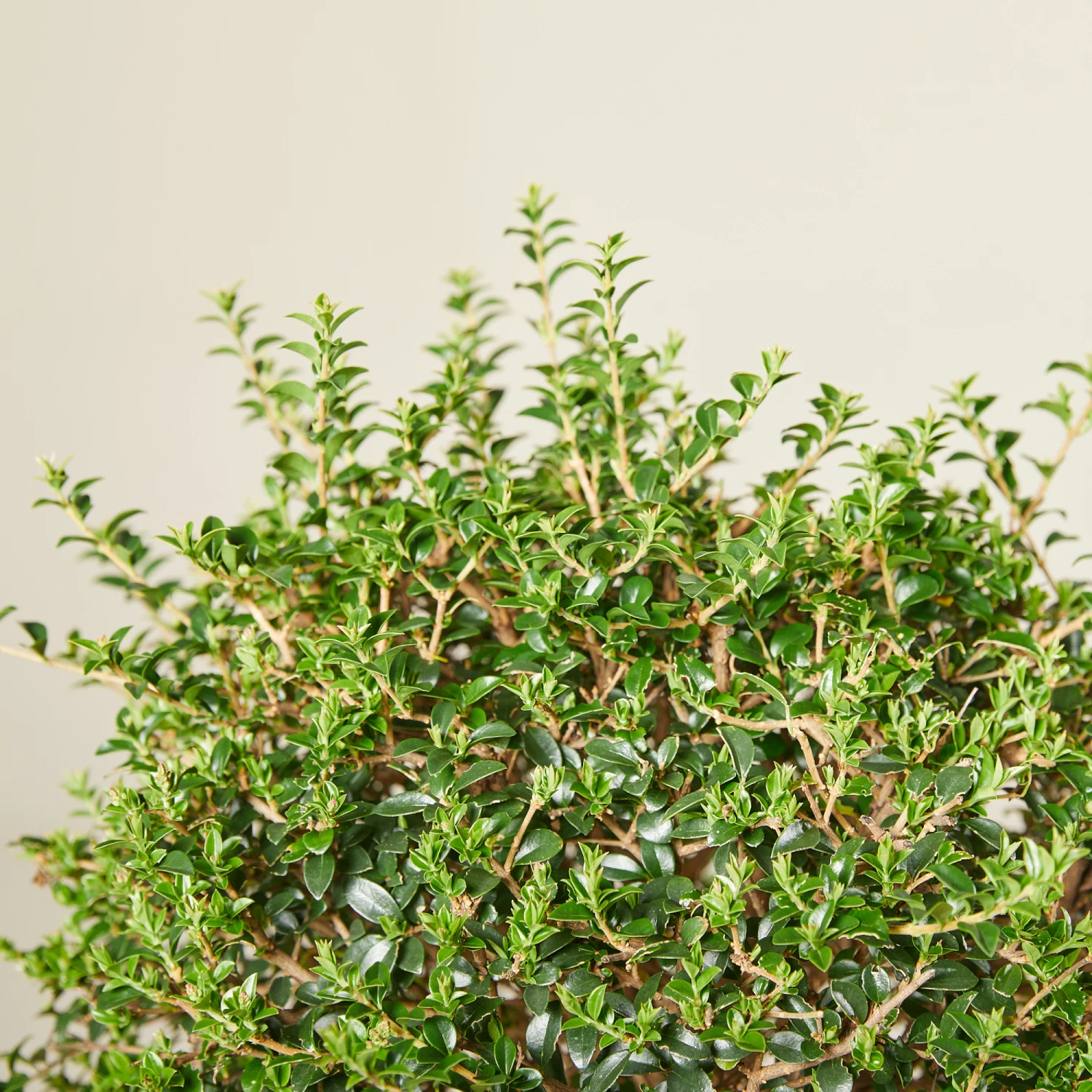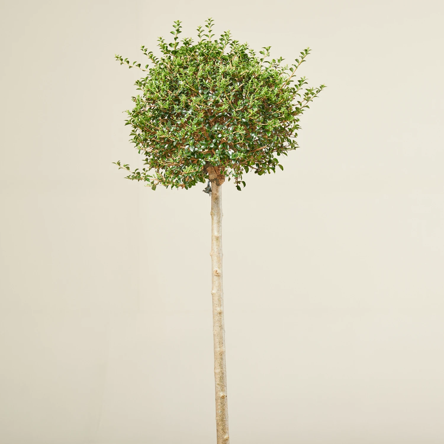 It features white creamy flowers in summer with a rather unusual scent, followed by black berries in autumn. It is commonly used in topiary for formal gardens.