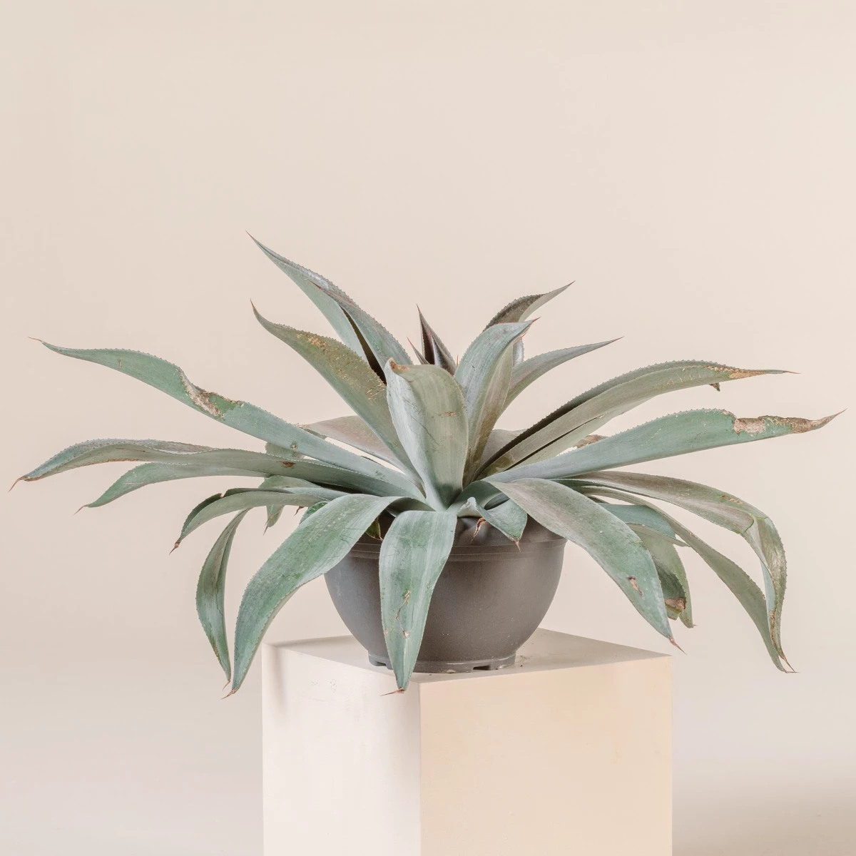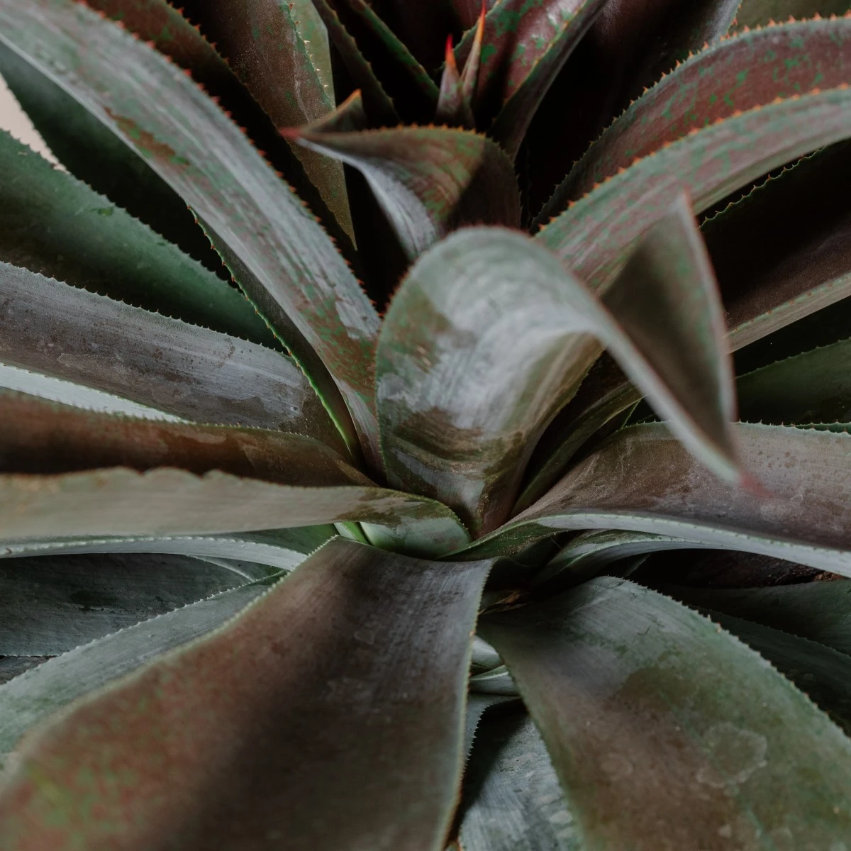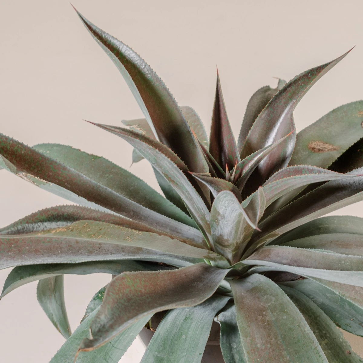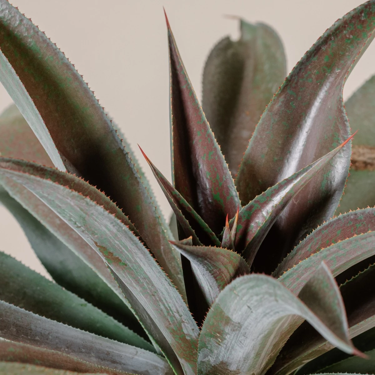 The wide blades of this Mangave are tinted bright red, hence its moniker. The colouration becomes more intense in direct UV light. The long leaves form an arching habit, caused by the tips of the leaves curving downward. Margins curl upward to show off its cinnamon spines, a nice colour complement to the red.
