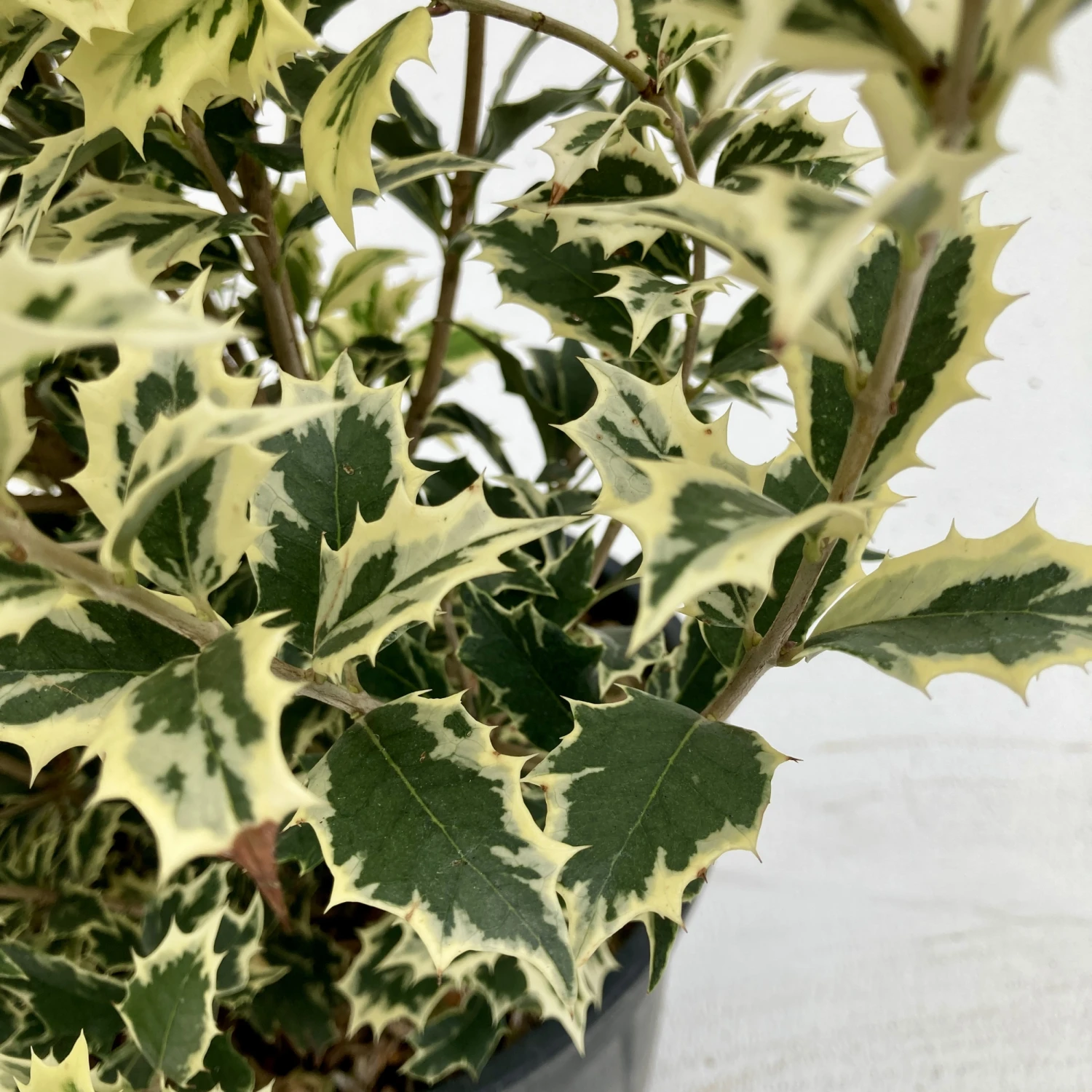 Osmanthus heterophyllus ‘Variegatus’, also known as Variegated Holly Olive, is a popular garden plant prized for its striking variegated leaves, featuring deep green with creamy white edges. This slow-growing, evergreen shrub typically reaches 1.5-2.5 metres in height and width, making it ideal for hedges, borders, or specimen plantings.