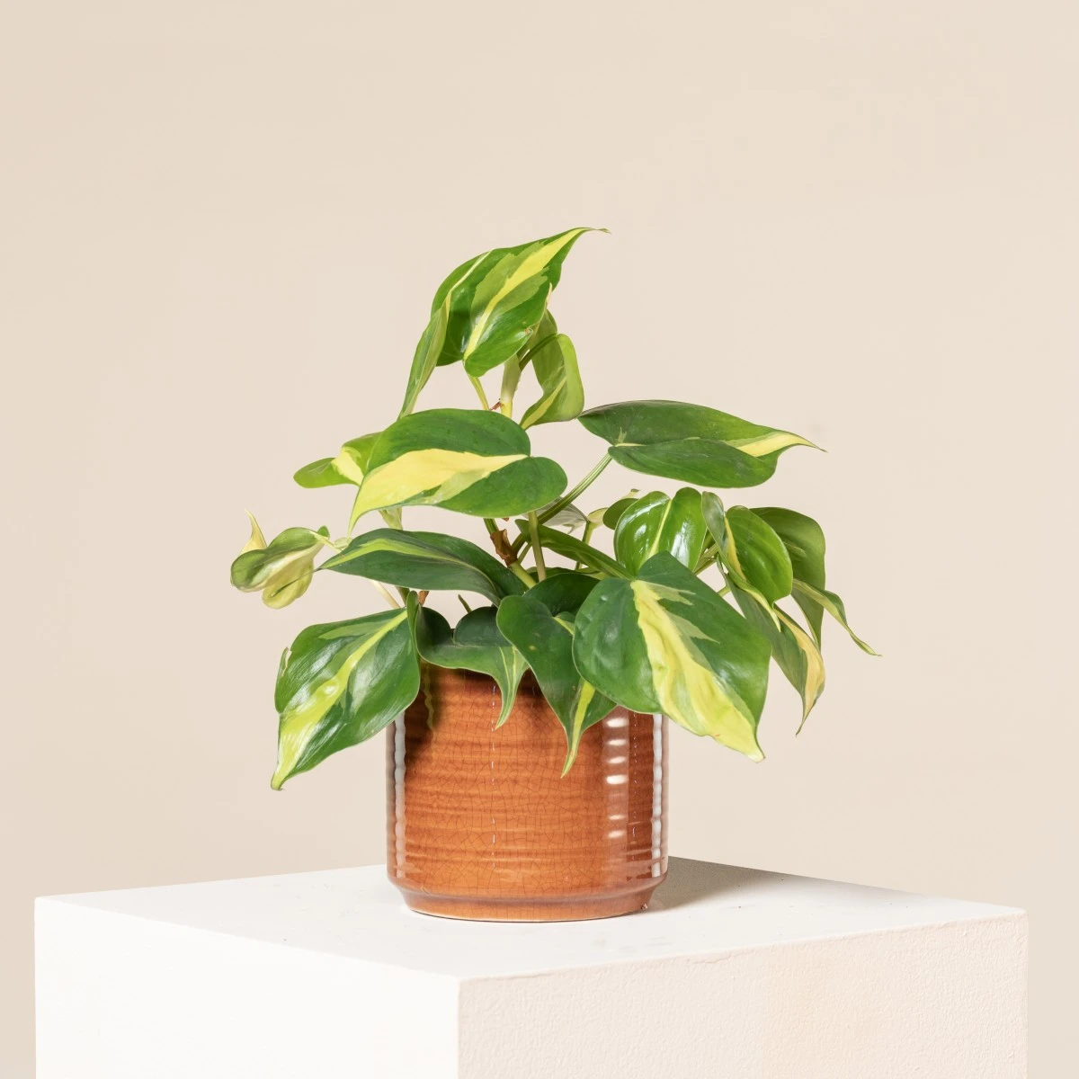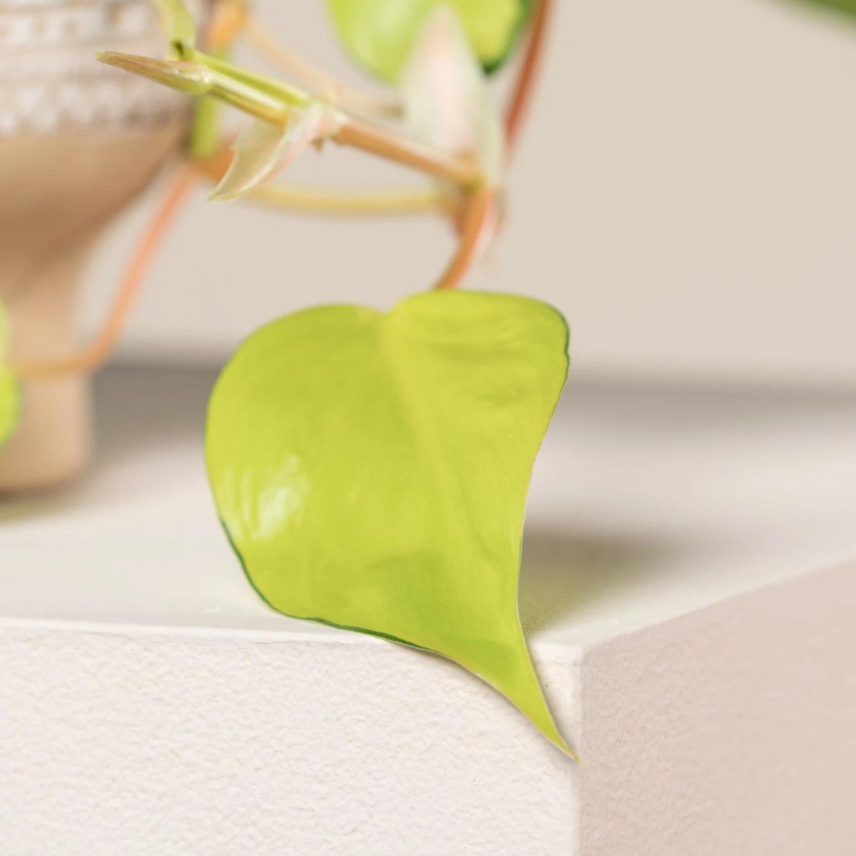 A stunning colourful variety of the classic climber/trailer from Central & South American and the Caribbean, with gold and green painted heart shaped leaves and peach toned new shoots. This makes a an easy and adaptable indoor plant for bright indirect light or some shade, and can grow to astonishing lengths.
